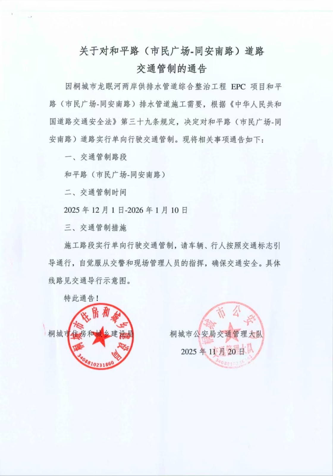 关于对和平路(市民广场—同安南路)道路交通管制的通告